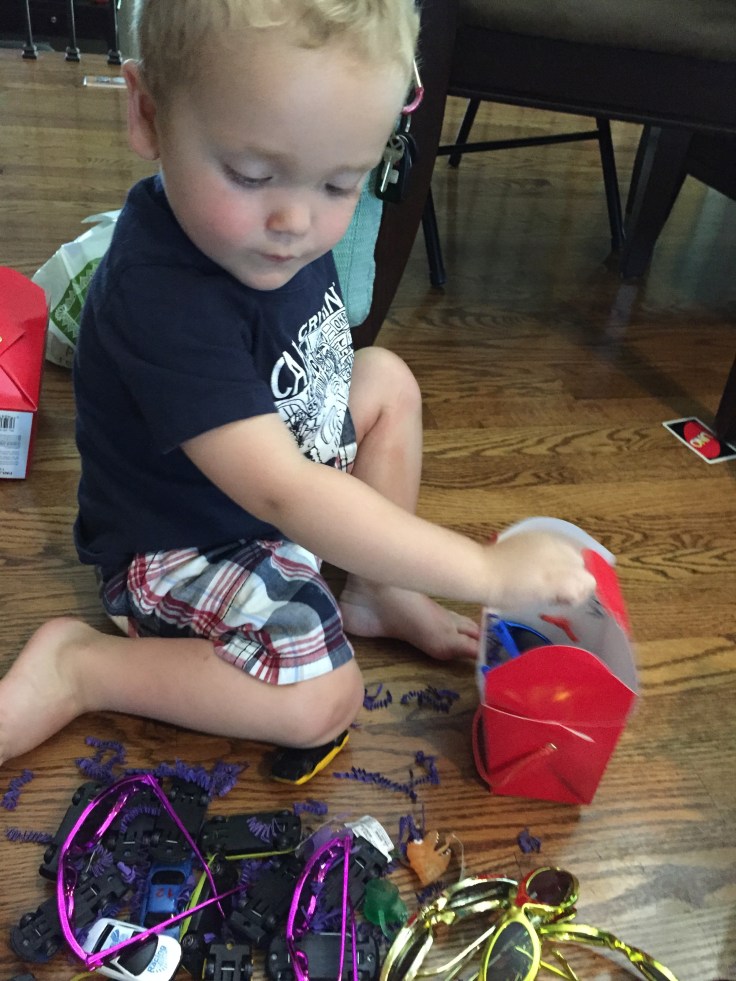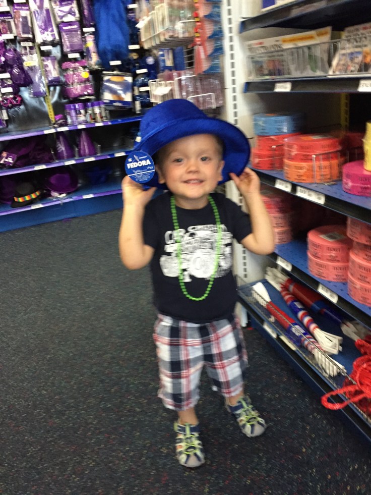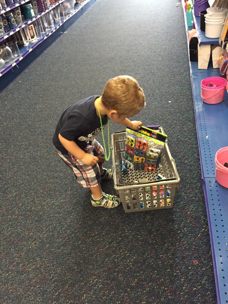 Bennett’s first selection was iridescent sunglasses.  If you know my son, this is a natural choice, as asscessories are his thing. Eventually he added monster finger puppets, cars, and bouncy balls to the basket.  I did have to intervene when he wanted to buy blue velvet pimp hats.  Thank goodness I was able to convince him the hats wouldn’t fit inside the boxes, “No match.”