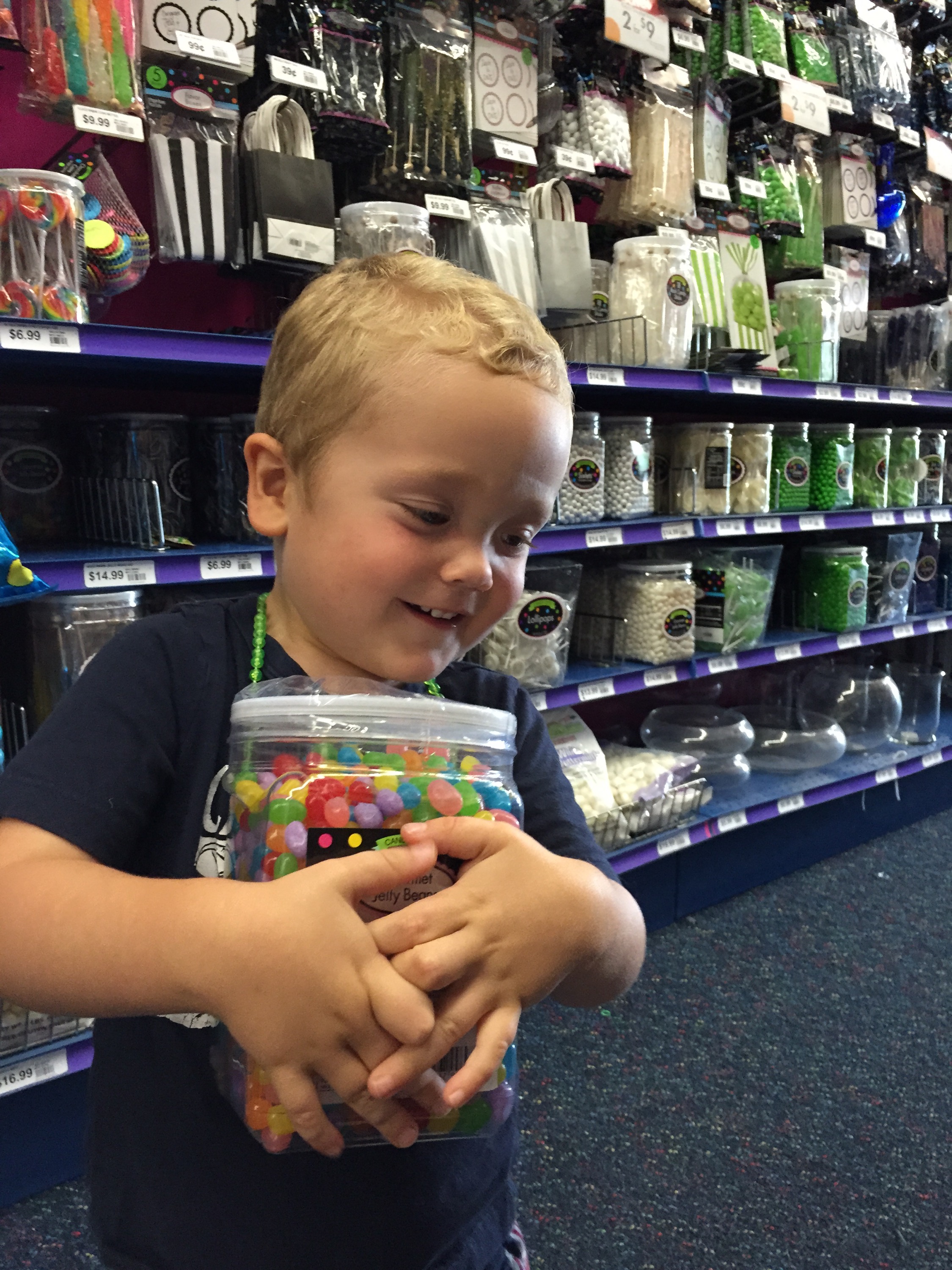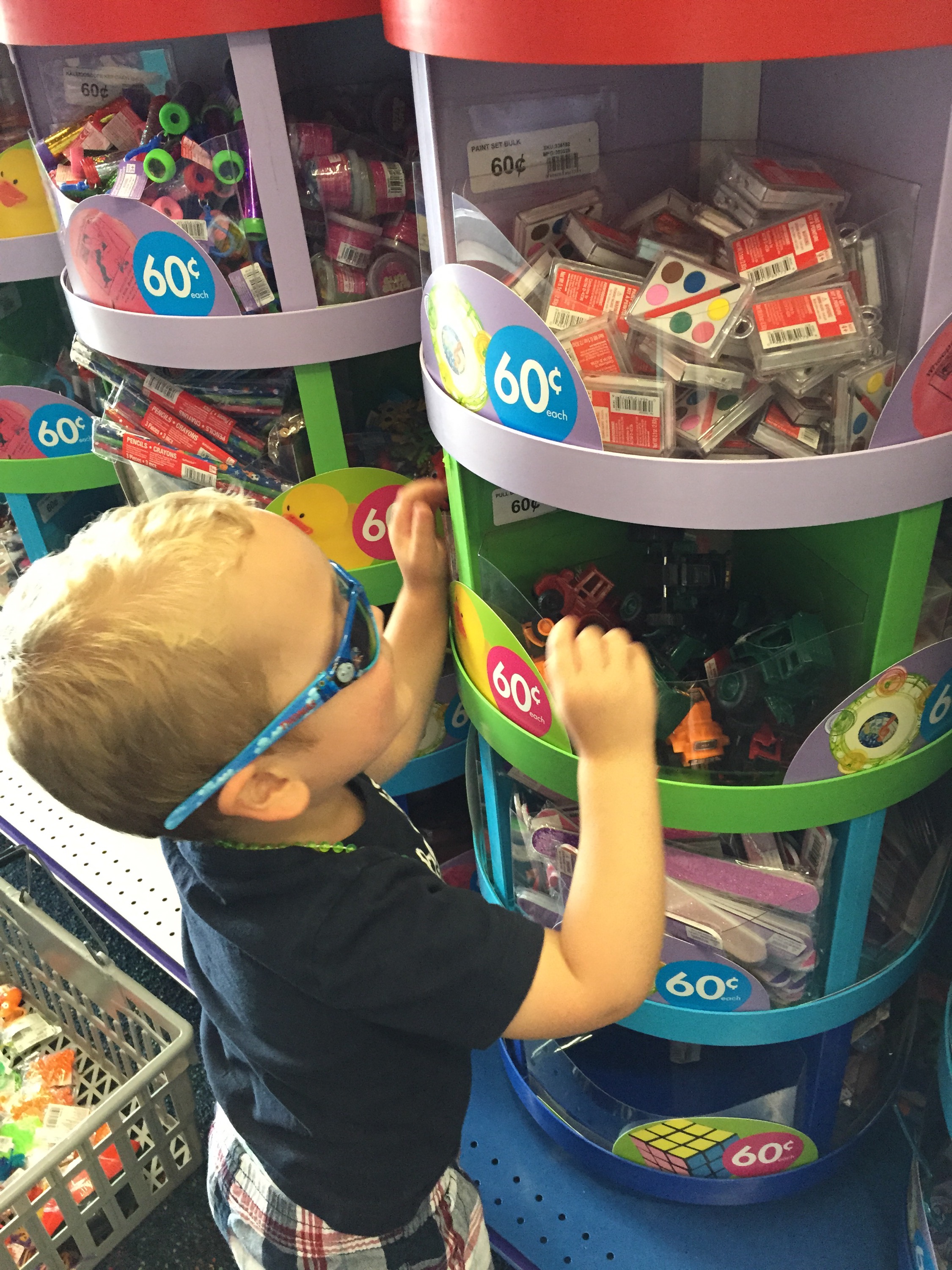 Bennett’s first selection was iridescent sunglasses.  If you know my son, this is a natural choice, as asscessories are his thing. Eventually he added monster finger puppets, cars, and bouncy balls to the basket.  I did have to intervene when he wanted to buy blue velvet pimp hats.  Thank goodness I was able to convince him the hats wouldn’t fit inside the boxes, “No match.”
