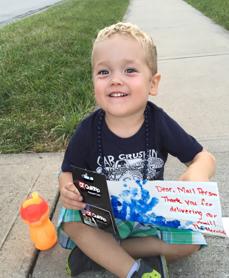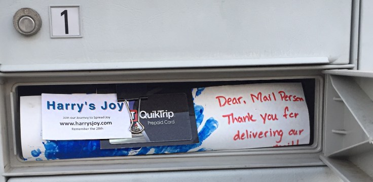 Another Harry’s Joy occurred. As you know, it is my goal to keep Bennett involved with our acts of kindness. Today, Bennett decorated the mailbox for out mail carrier, read a book about kindness, and saved a worm’s life.