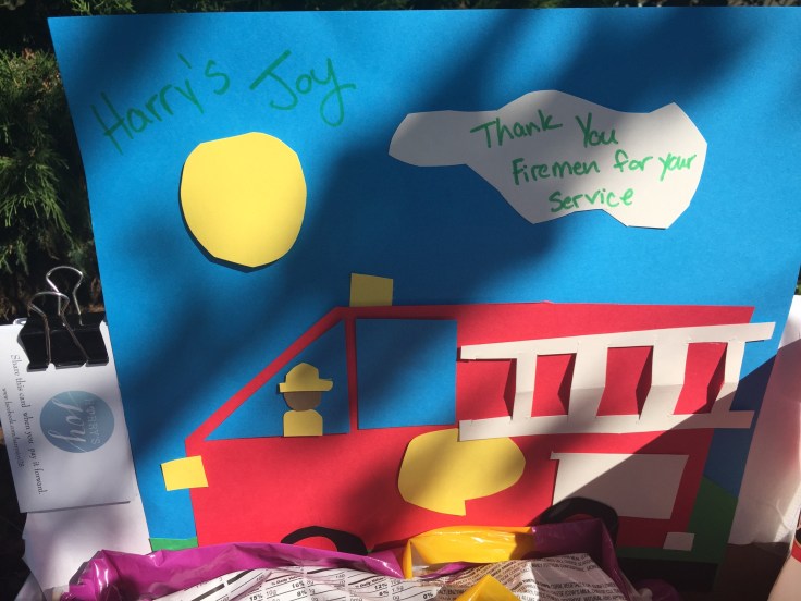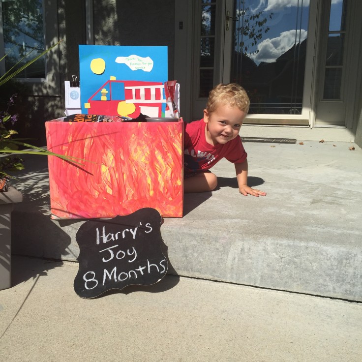 This Monday another 28th occurred and another Harry’s Joy took place. This month we delivered treats to the fire station. Bennett spent the week decorating the box that contained the treats as well as discussing how we would make the firemen happy. When we arrived at the fire station our box was reciprocated with a tour of the fire trucks. Bennett got in the trucks, checked out the outfits, honked the horn, and gave each fire fighter a high five. I feel like we ended up receiving the gift this month!