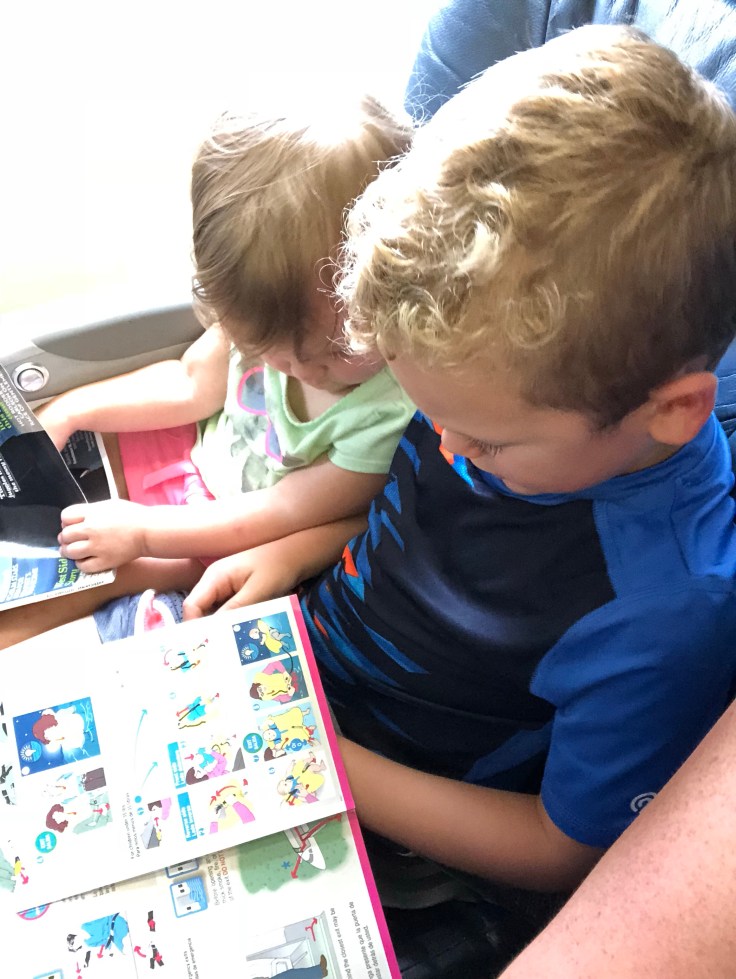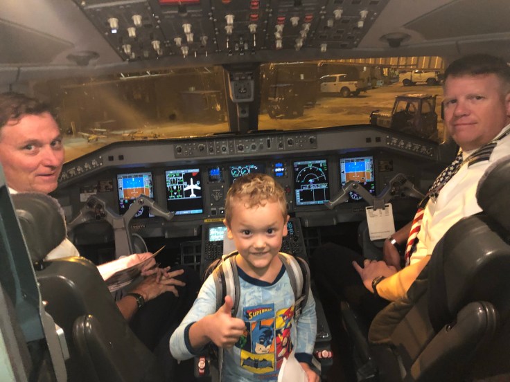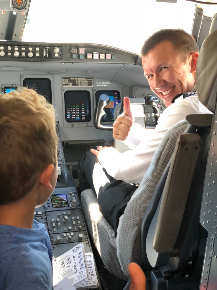 Finally both kids are dressed and we look a touch more pulled together. We headed back to our seats where Bennett insisted we read the safety manual over and over. Now that we are prepared for a water evacuation, let’s land this thing.