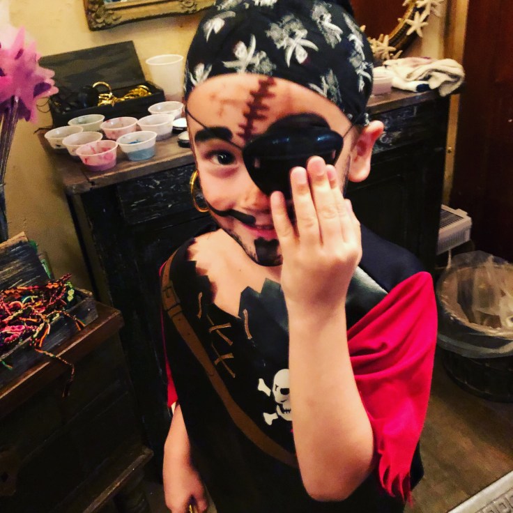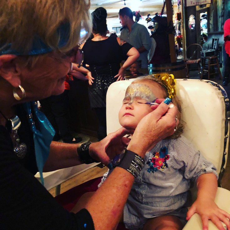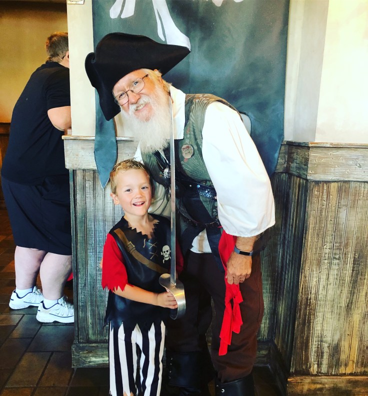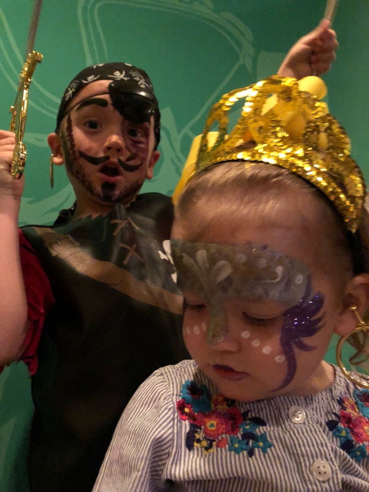 On day 3, Monday, we spent another day at the beach and in the pool. We finished the day going to a dinner theater Pirates Voyage. The kids got dressed up as a pirate and a mermaid. The show had acrobats, sword fights, cannons, diving, and sea lion tricks. Both kids were mesmerized, plus both kids ate like champs! šš»