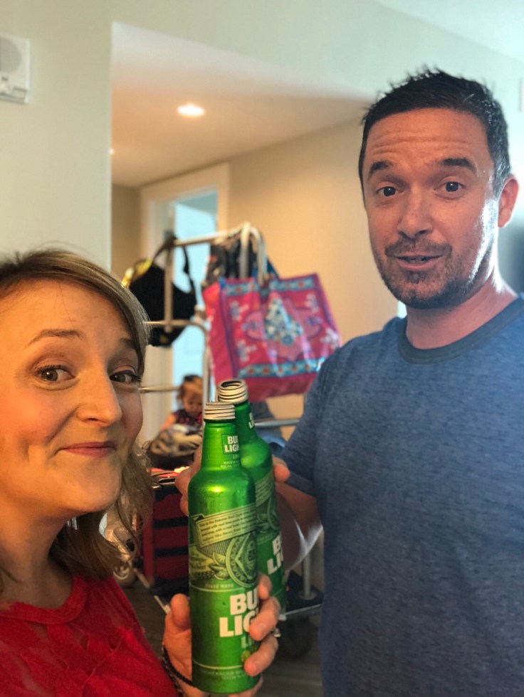 We pull up to the sky cap and THERE IS NO LINE!!! There is a God!!! Jason pulls up. We leap out and grab all the bags and both kids. Jason hands me a wad of cash to tip and then jumped back in the car to park. Now alone with the kids, I stumble through all 999 pockets in my backpack to find my ID as I continue to drop dollar bills from my hands. Finally I look up at the sky cap attendant and say… “why don’t I just tip you first and get this money out of my hand.” He smiled, “why thank you.”