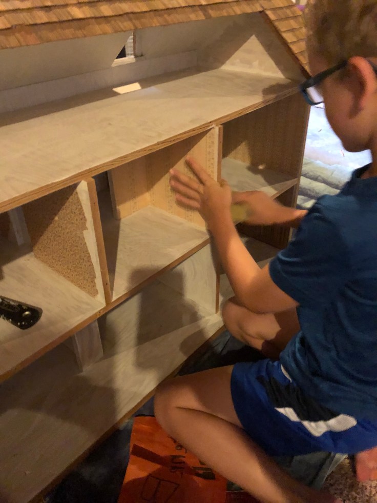 Then we sanded the entire house, brushed the wallpaper with water the scraped it off. My son was a great help at this task.