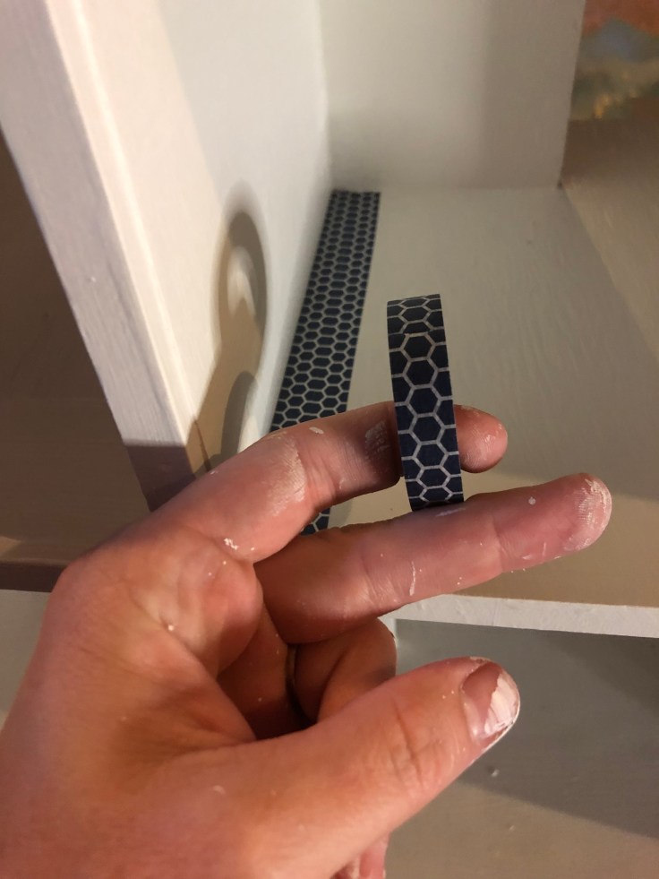 I found washi tape at Micheals with a hexagon shaped pattern. It reminded me of tile. So taped it to the bathroom floor and used Mod Podge for a glossy overlay to create a tile floor. This was super easy!!
