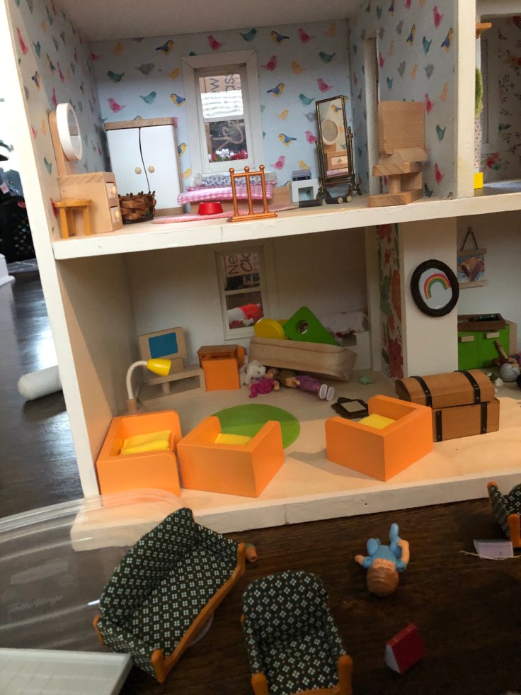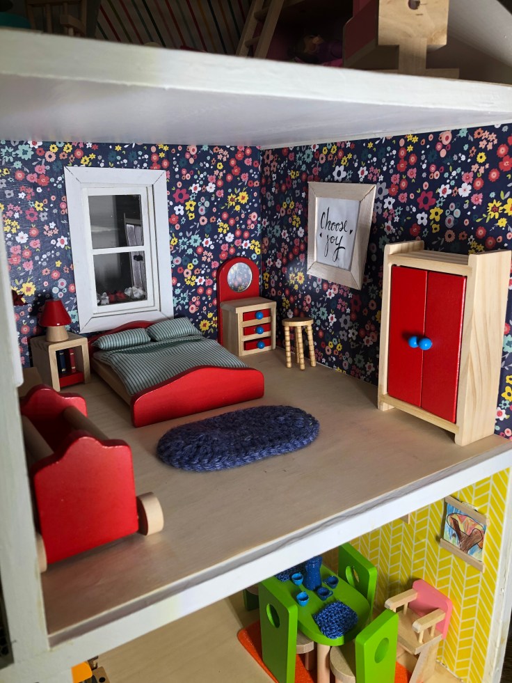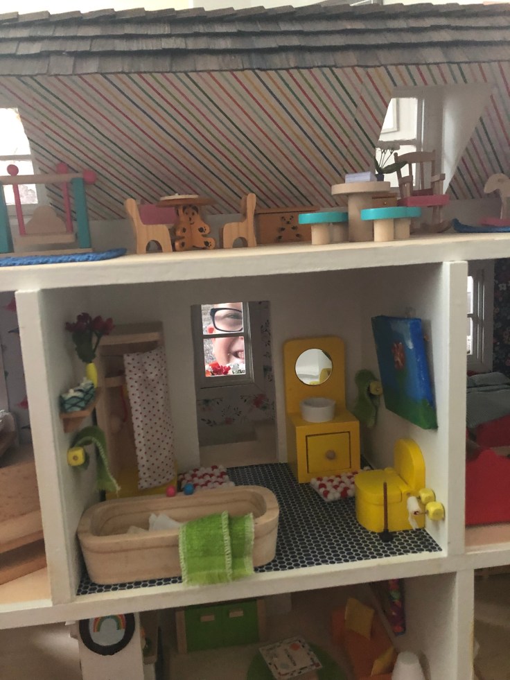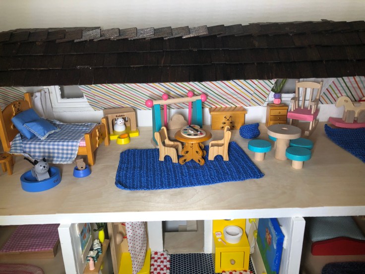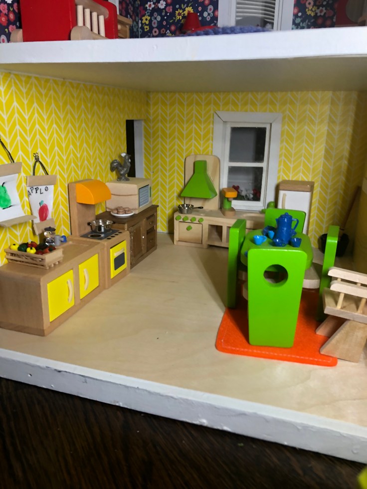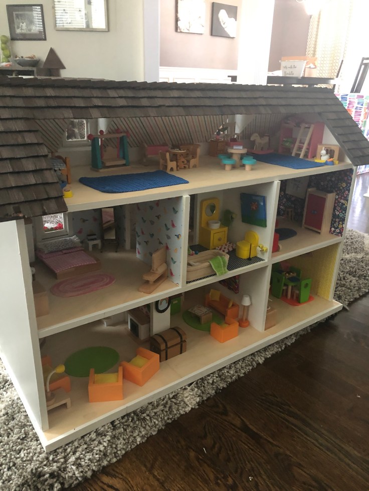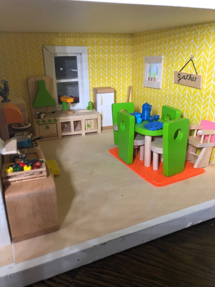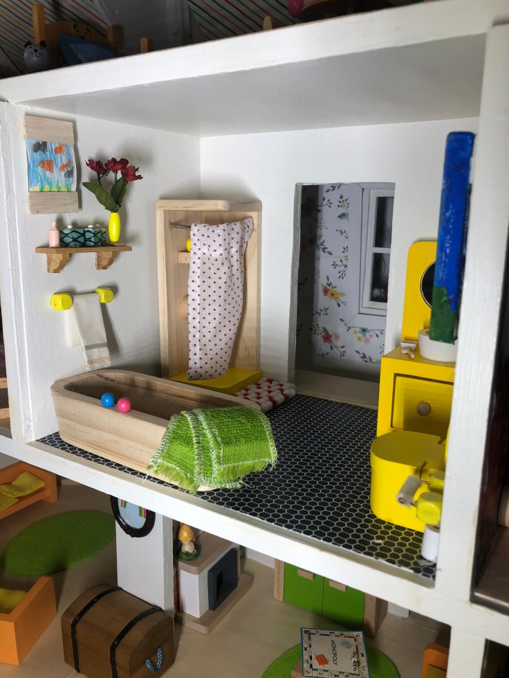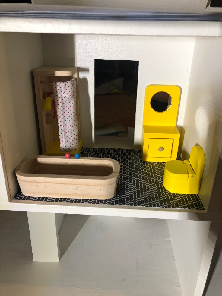 After it dried I moved in the bathroom fixtures. All of my dollhouse furniture was purchased from Amazon. I bought furniture that could withstand use by my 2 year old daughter. This room needs some decor!!! But I’m saving that for last. Also, I’m still debating if I need a door. Clearly Bathrooms usually have doors. But without it, it might make play easier. So I’m going to think on that….