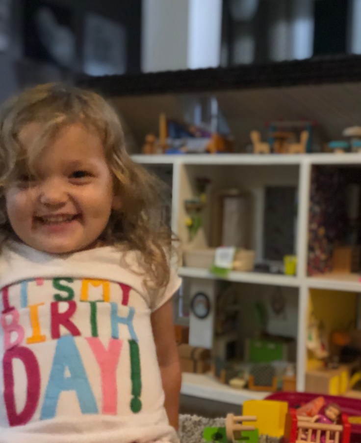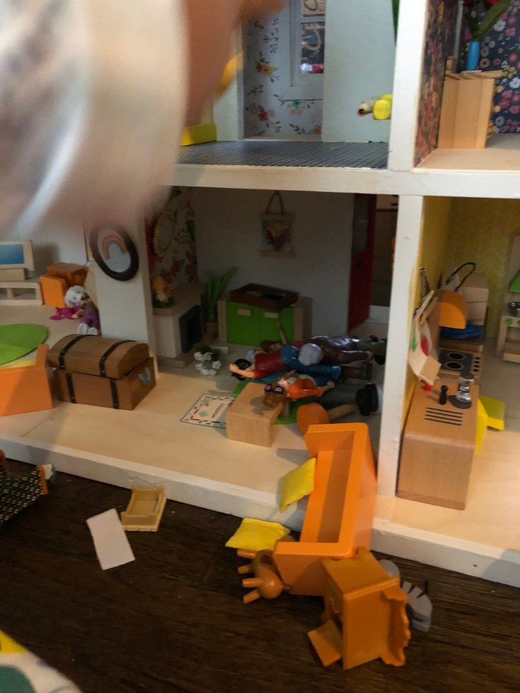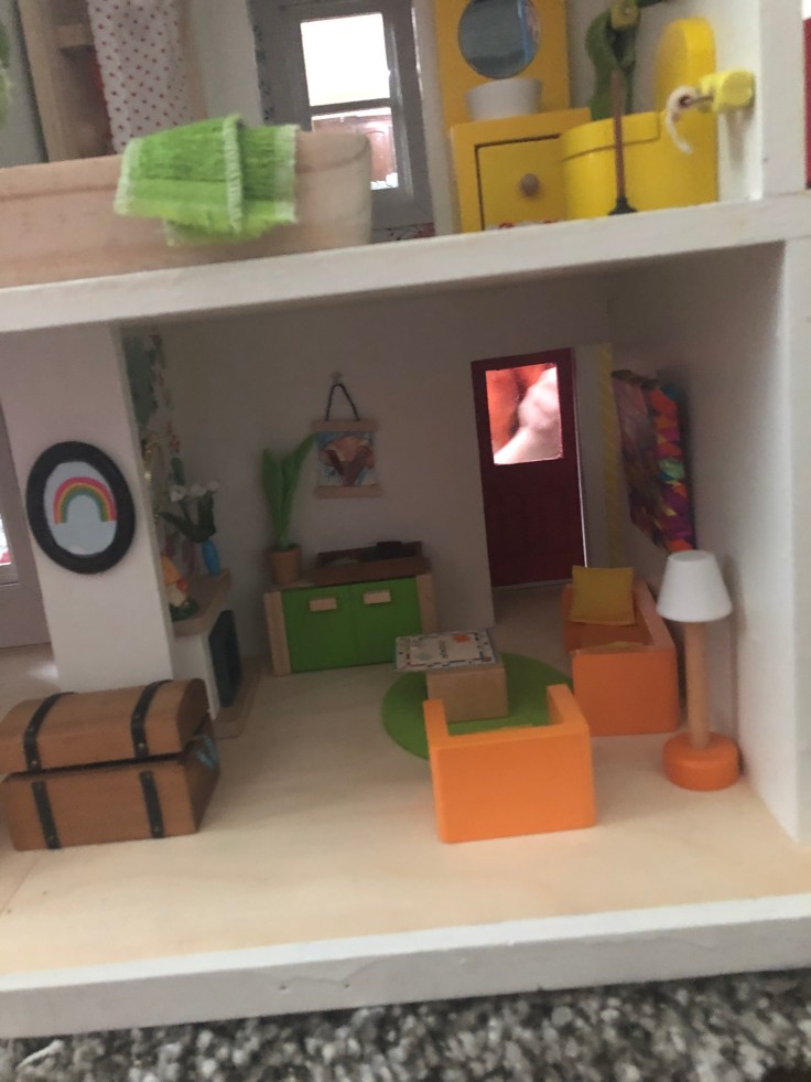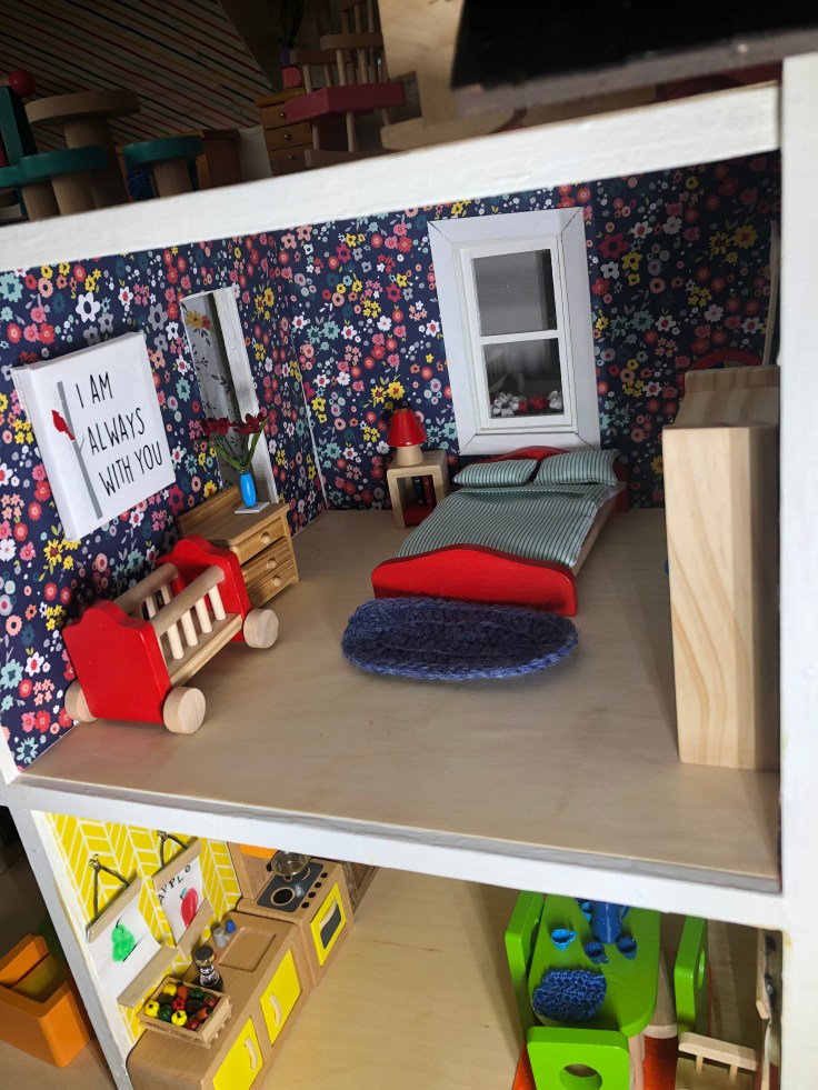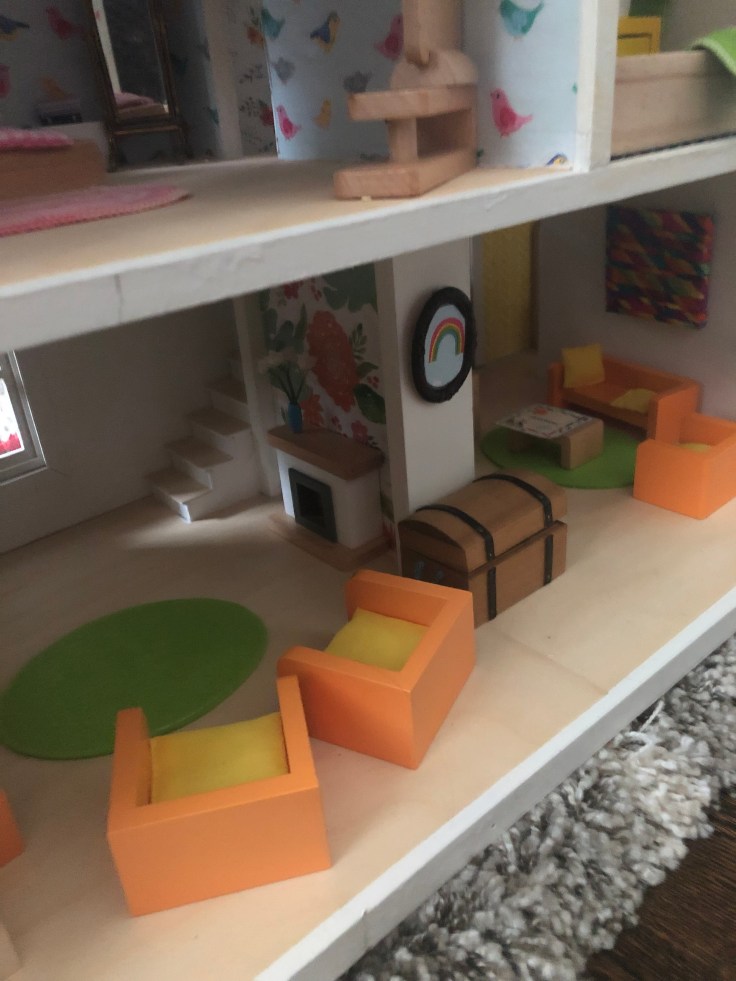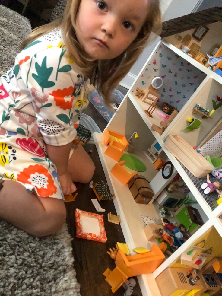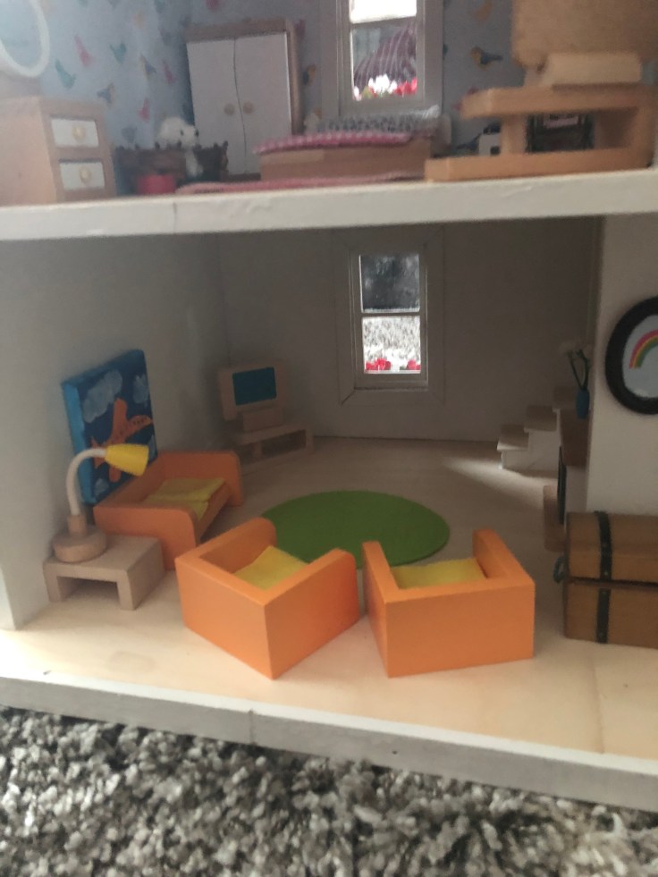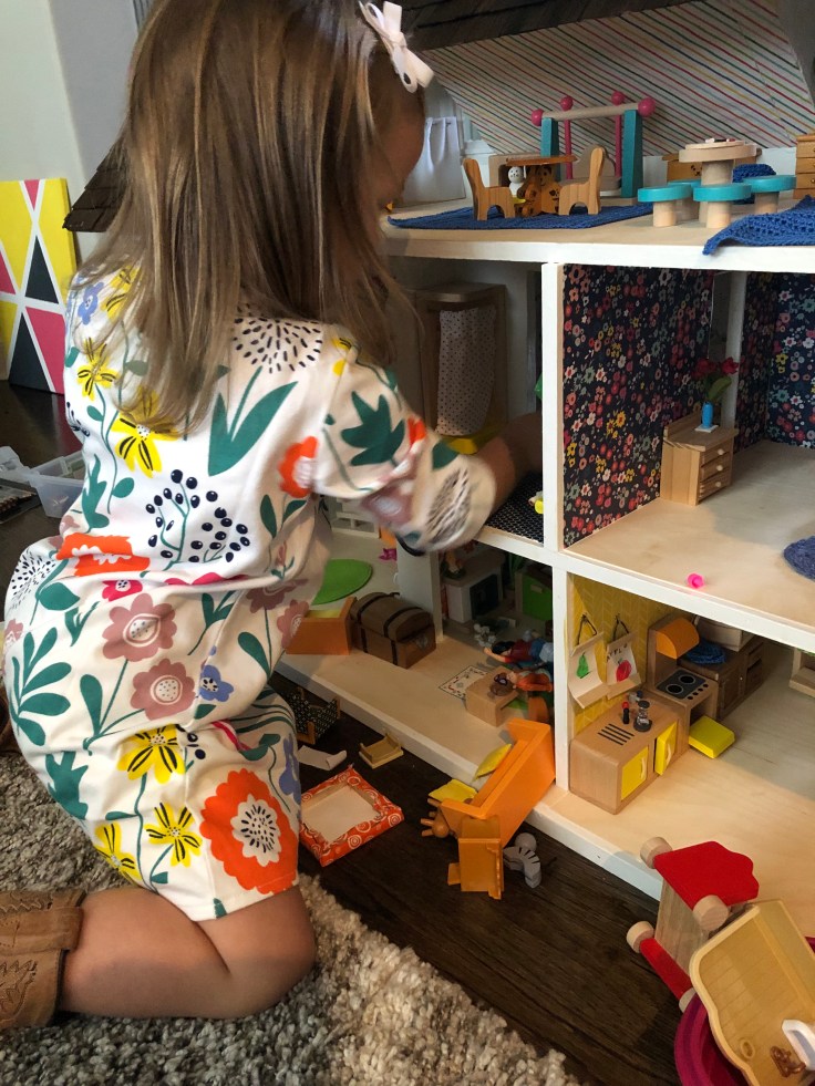 After it dried I moved in the bathroom fixtures. All of my dollhouse furniture was purchased from Amazon. I bought furniture that could withstand use by my 2 year old daughter. This room needs some decor!!! But I’m saving that for last. Also, I’m still debating if I need a door. Clearly Bathrooms usually have doors. But without it, it might make play easier. So I’m going to think on that….