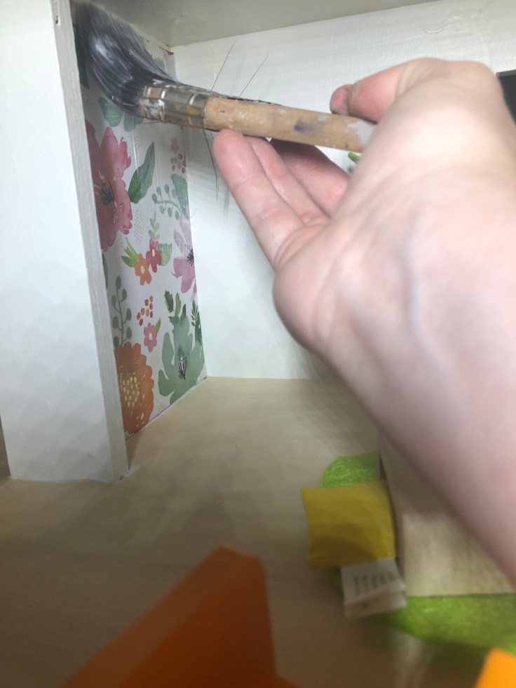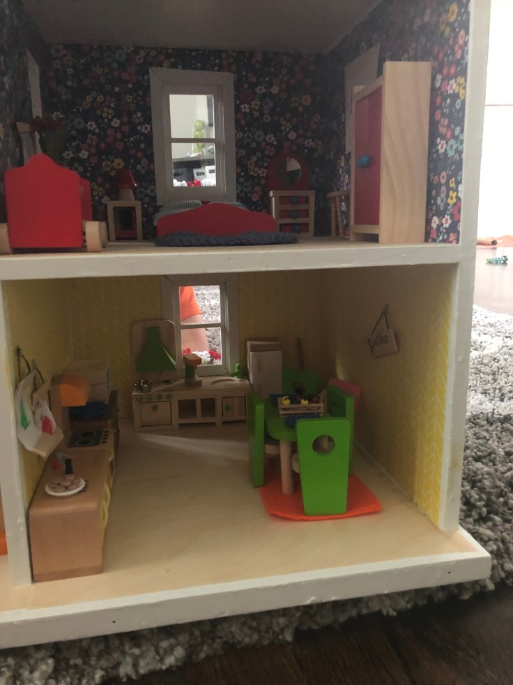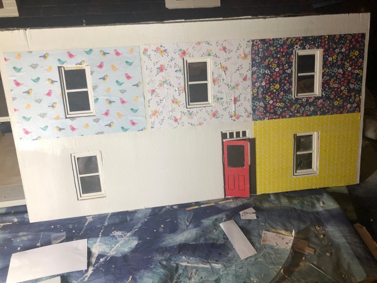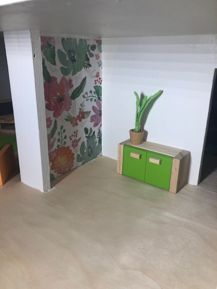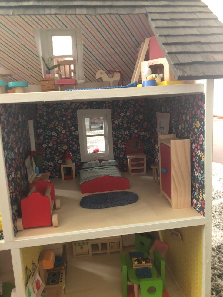 The next step I bounced back to the inside and installed the wall paper. This was simple! I used craft paper and mod Podge. The process was fast, however I HIGHLY recommend you take the back off the house for this step. I also recommend not working with complicated stripe patterns. I don’t like how my stripes turned out.
