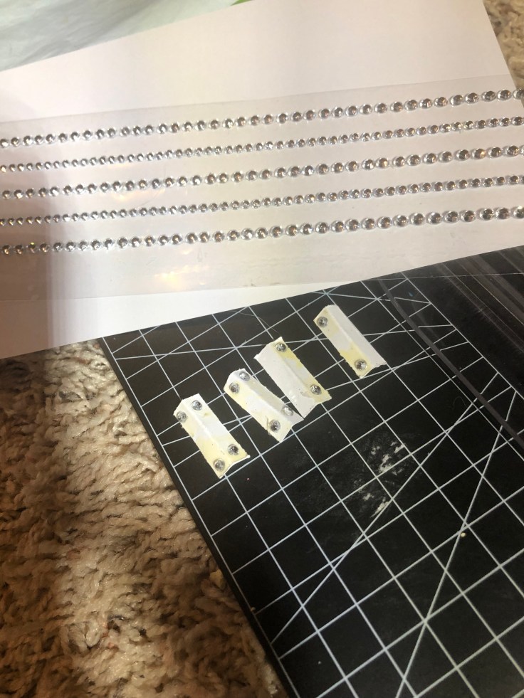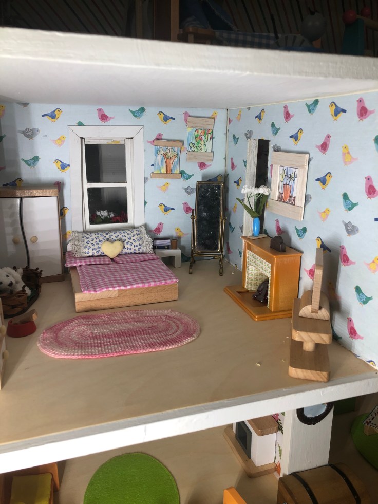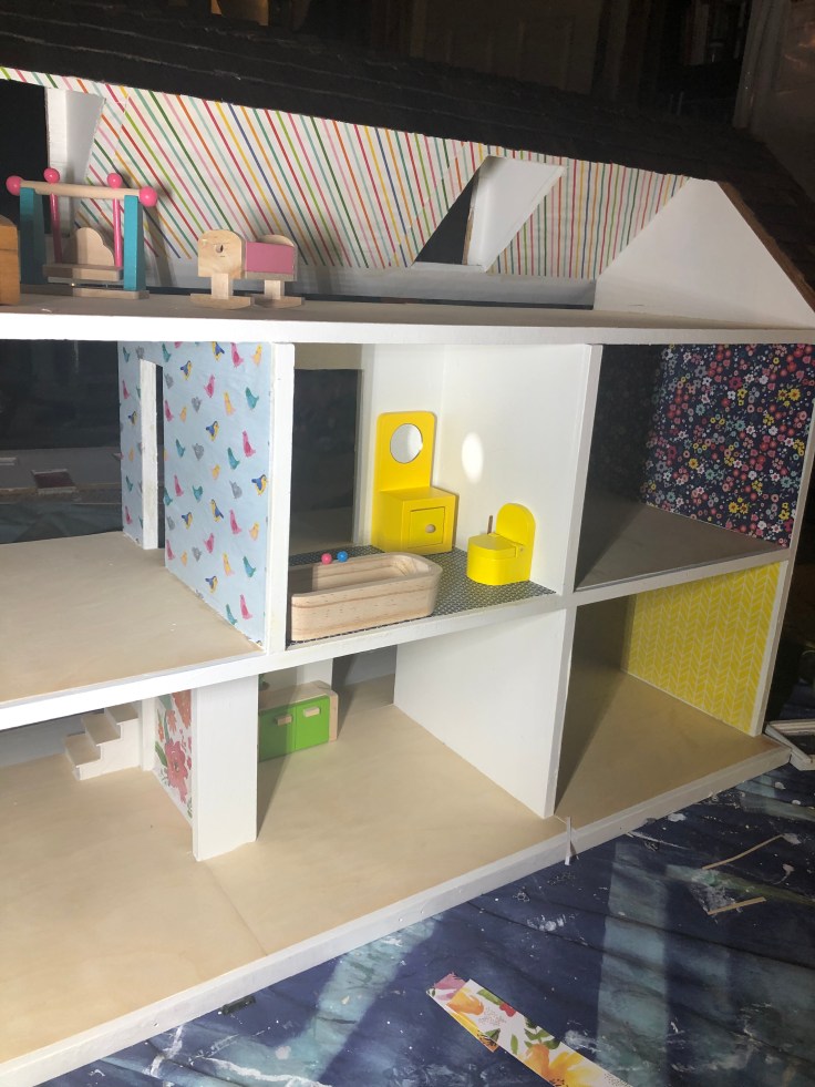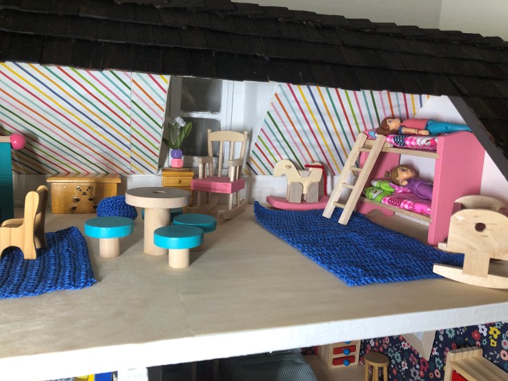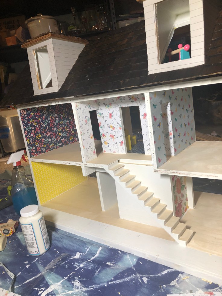 The next step I bounced back to the inside and installed the wall paper. This was simple! I used craft paper and mod Podge. The process was fast, however I HIGHLY recommend you take the back off the house for this step. I also recommend not working with complicated stripe patterns. I don’t like how my stripes turned out.