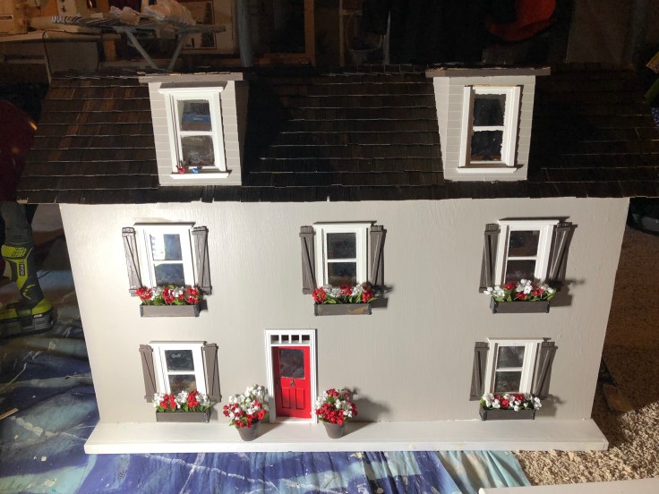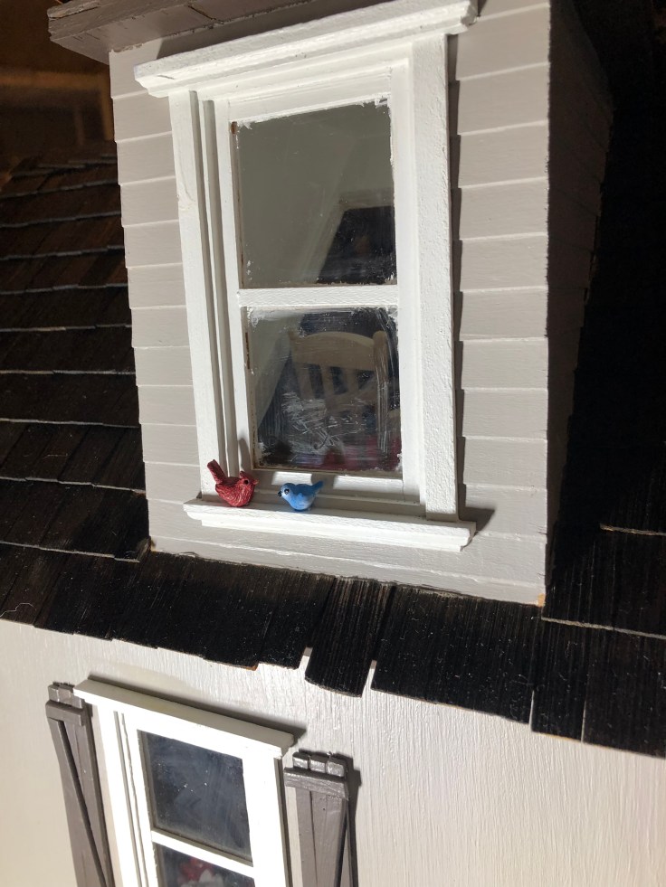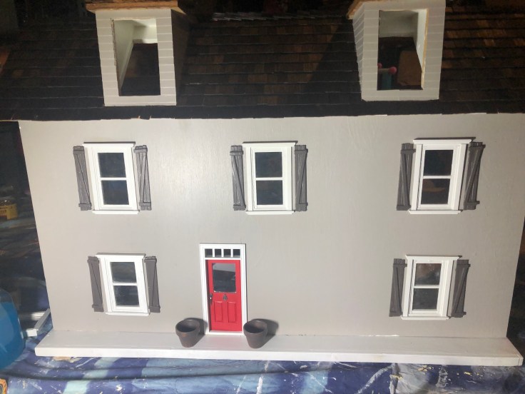 At this point I carefully reattached the front of the house and painted the raw edge of the roof trim black to match the shutters.