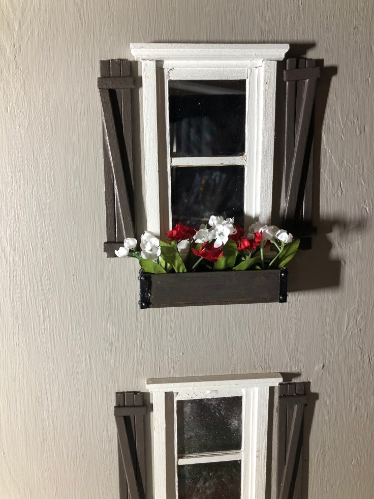 Now back to the flower boxes. I stuffed the with black clay and the pressed silk flowers into the clay. I kept having issues with the brackets on the flower boxes falling off. So I hot glued them. I read blogs that warned against hot glue. But honestly it drys fast and worked great. So I went ahead and used the hot glue to attach my window boxes.