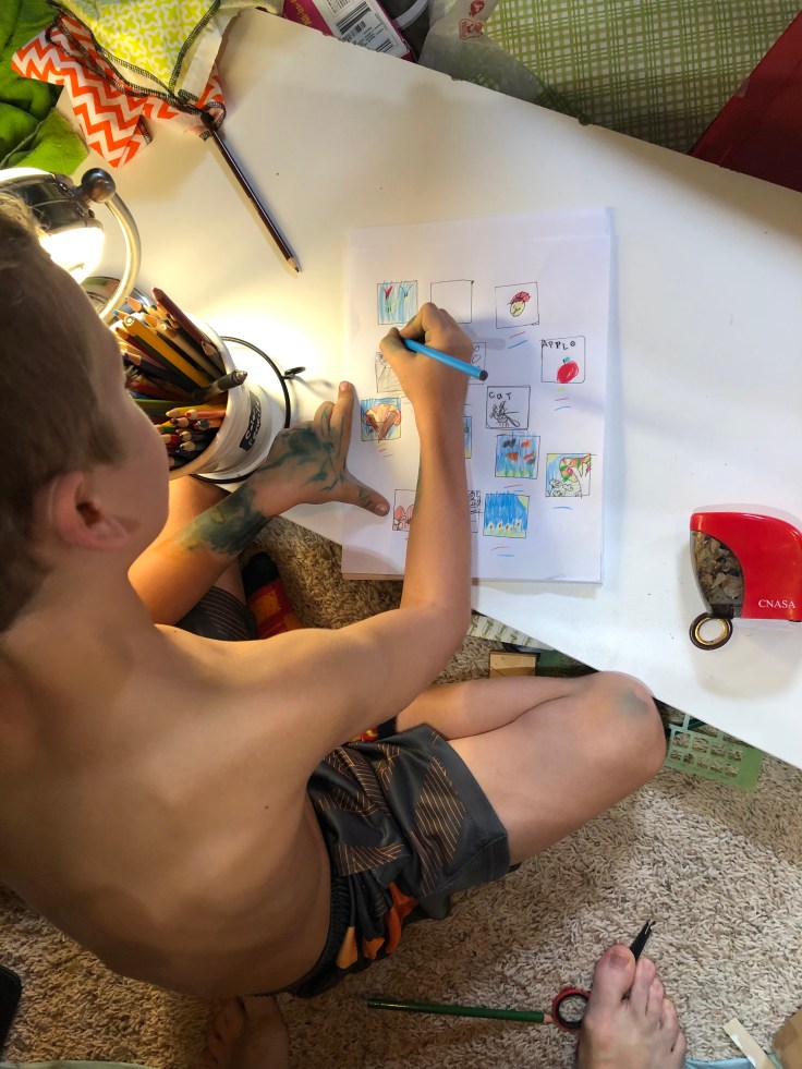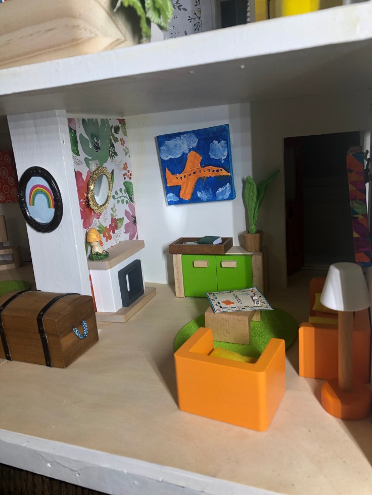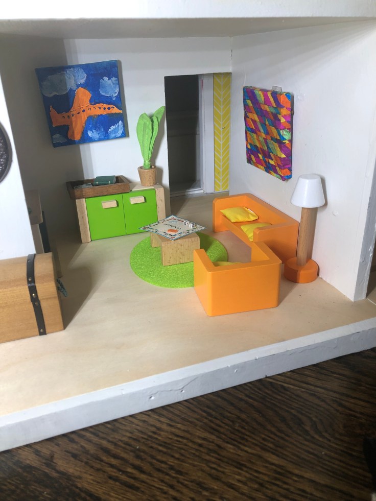 Now for some finishing touches. I moved in the furniture and accessories. And my son and a sweet neighbor helped me with creating artwork.