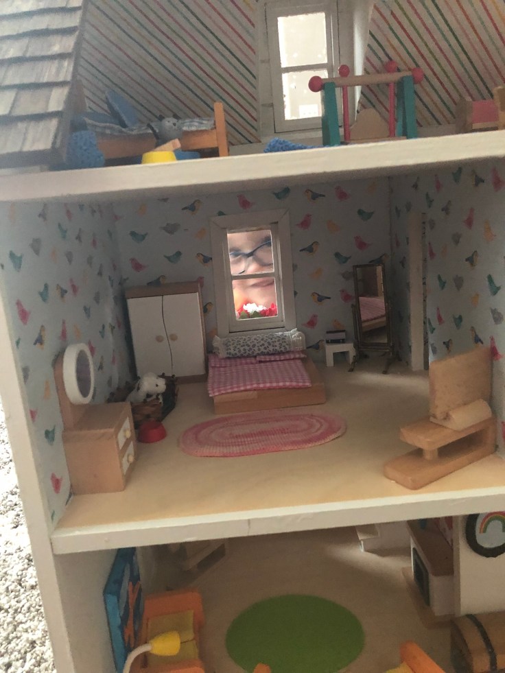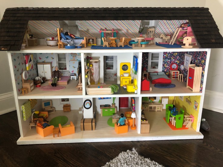 I was so excited a year ago when my daughter inherited my sister-in-laws childhood dollhouse. It was built by her father and had been tucked away in their basement. So when she reached out to ask if it was something we would enjoy I didn’t hesitate for a second. When I was a girl I had a Barbie Dream House. It was big, plastic, and pink. One of my girlfriends had a traditional dollhouse and I always admired its character. So I could think of nothing better than to inherit a REAL dollhouse! So I guess this was a gift for my daughter, but as you can see, I was THRILLED to inherit it too.